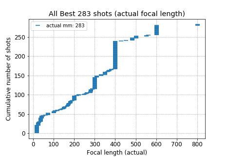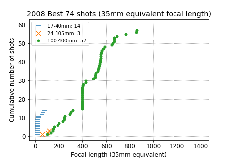 Below are charts of the focal lengths of all the shots that I considered the best from each trip, broken out by lens. For each trip there are two charts, one for actual focal length as recorded in the EXIF data, and one for 35mm-equivalent focal length after cropping. By that I mean, if the focal length on the lens is set at 200mm, but I crop the photo down to half the size in both vertical and horizontal directions, then the equivalent focal length is 400mm. This tells me what focal length I wanted to have when I was getting the shot, not what lens I happened to have in hand.