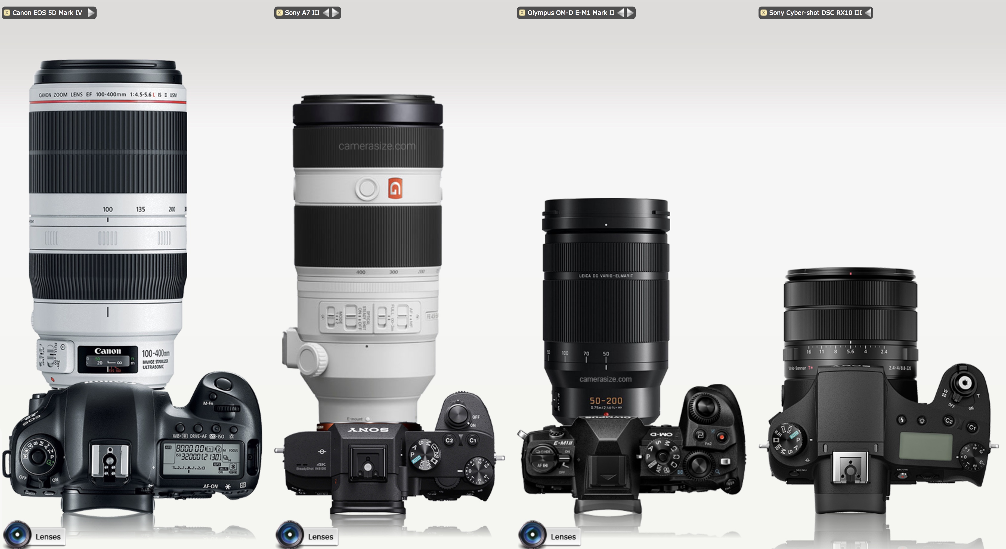 This is easy: if you already have a recent interchangeable lens camera (DSLR or mirrorless, full-frame, crop or micro-4/3, any manufacturer) you'll be fine. Don't worry about it. (OK, I admit a higher-end camera does give you a slight advantage for fast-moving birds in flight, but that's the only circumstance on Galapagos where your camera might limit you.) Below are four setups: a full-frame Canon DSLR with 100-400mm lens (similar to what I used); a full-frame Sony mirrorless with 100-400mm lens (similar to what my friend Steve Mandel used in 2019 and let me borrow a few times—I found little difference between the Sony and Canon systems); a micro-4/3 camera (whose sensor is about 1/4 frame) with a 100-400mm equivalent lens; and, for comparison, a non-interchangeable-lens bridge camera (the Sony RX10, whose sensor is about 1/7 frame) with a 24-600mm equivalent zoom. You can also see a comparison of smaller, less expensive APS-C options.