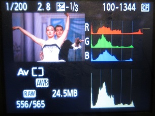 The second thing is your most important guide to judging your image: the histogram. The histogram shows the relative number of pixels at different light intensities from very dark (on the left) to very light (on the right). If the histogram has a bump (or bumps) in the middle, you're good. If there is a bump crunched up against the left edge that is a potential problem. It means that some details are lost in shadow. That might be fine (you want the unlit edges of the stage to be black) or it may mean that you need to add positive exposure compensation (to get detail back). At the other end, if a bump is crunching against the right edge, you may need negative exposure compensation to bring the details back from the white highlights.